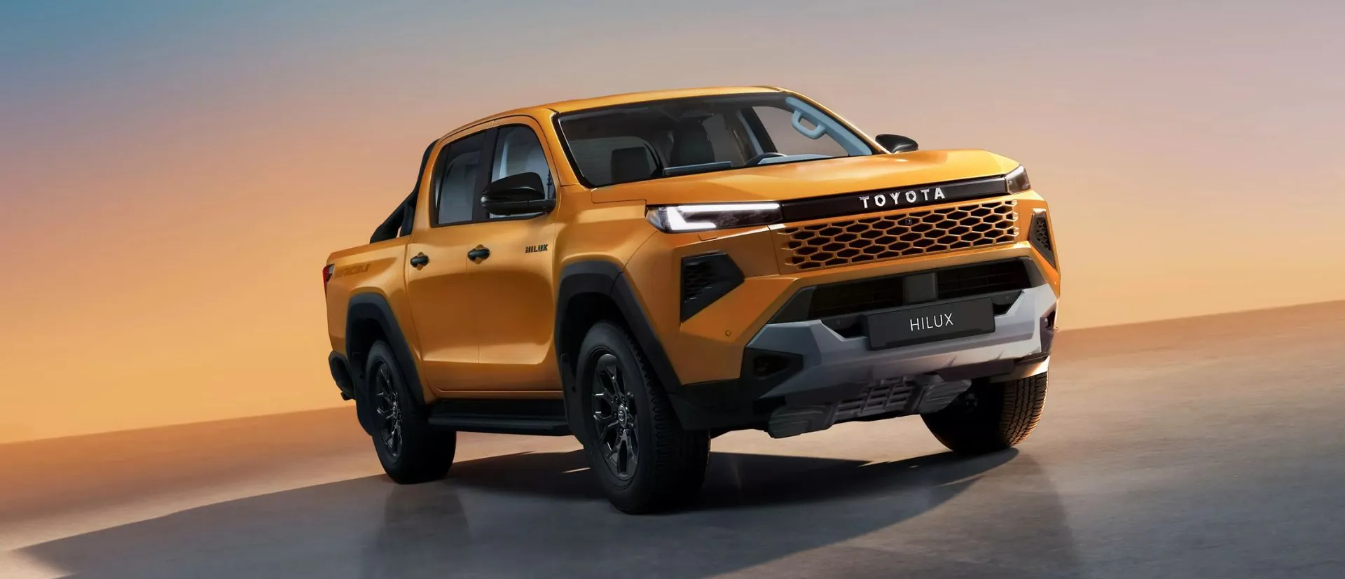 Nowa Toyota Hilux zachęca do działania w każdych warunkach. Dynamiczna, muskularna linia nadwozia, wyraźnie zarysowana maska, nowoczesne reflektory oraz charakterystyczny napis TOYOTA tworzą spójną całość, łącząc klasyczny charakter pick-upa z nowoczesnym designem.